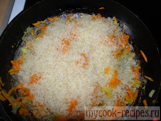 - Обжарить на растительном масле лук, потом добавить морковь, а после рис, и залить всё горячей водой.