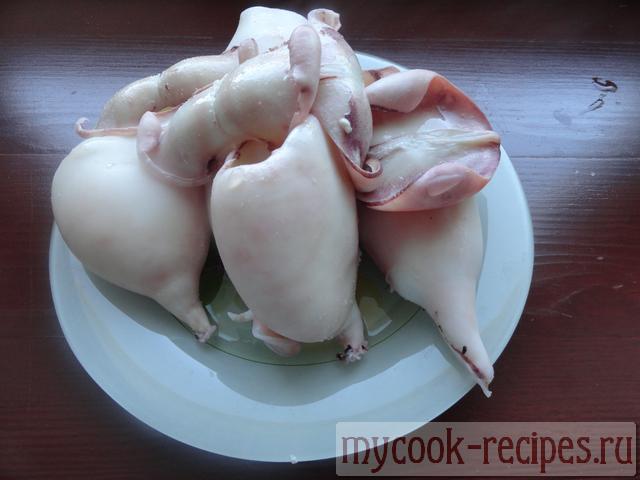 - Будем отталкиваться от самой распространенной формы кальмаров – мороженной. Для начала вам нужно будет разморозить их и хорошо промыть.